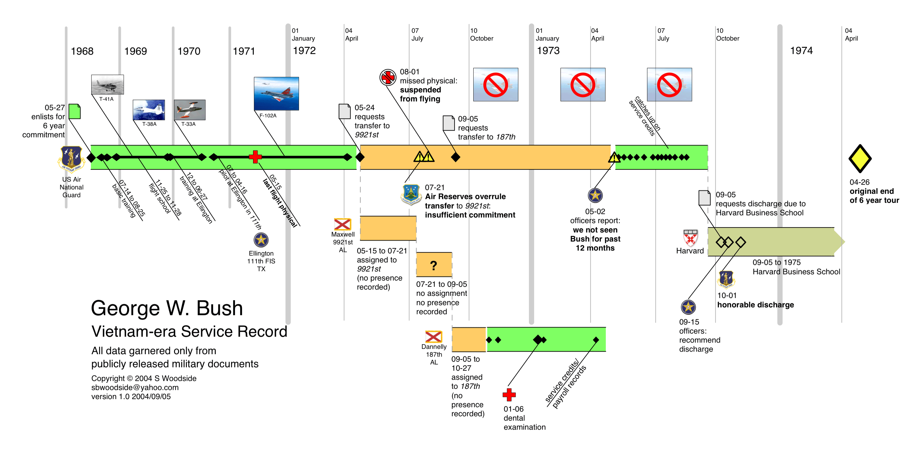 Here’s a visual explanation of W’s air national guard record. I used only documents released by the military (in other words, official service documents) to build the graphic.